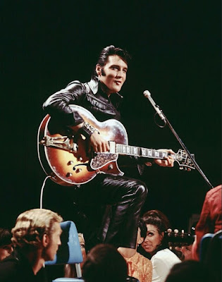 One of the biggest coups Binder managed for the special was to deck out Presley in a black leather jumpsuit, reunited him with his former bandmates Scottie Moore and DJ Fontana (-- sadly, Bill Black had passed away in October, 1965), put him on a small stage, and let him jam for an appreciative studio audience.