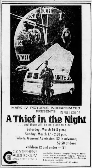 Nah. It's just all this talk about the allegedly nigh Biblical Apocalypse has got me to reminiscing about a trippy scare film concerning the Rapture and the Tribulation, which I was exposed to by a rickety projector and some shitty synch-sound in a church basement many, many moons ago called A Thief in the Night (1972).